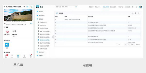 (场外的债权人通过钉钉在手机或电脑上观看会议直播) 钉钉+氚云为“智慧法院”的打造提供全程支持 从今年8月份开始,钉钉&氚云团队就多次与富阳法院进行探讨,并逐步明确“钉钉+氚云”的互联网模式在债权人线上会议中能体现的价值,通过氚云平台量身定制了债权人管理、投票管理、管理人评价等系统,完善了从债权人实名认证到建立投票系统,再到投票结果统计的整套流程系统。