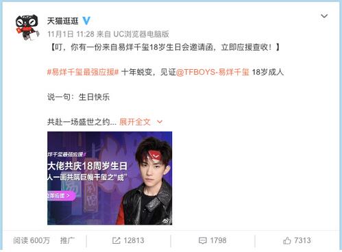 与此同时,线上的应援氛围也相当热烈,粉丝通过链接进入H5页面,或者打开手机淘宝/天猫搜索“易烊千玺应援”就能进行页面完成应援。 据了解,这场大规模线上线下的应援活动由天猫新零售携手华为nova3、沙宣两大品牌,联合易烊千玺工作室于11月1日共同发起。1月1日当天11点28分,天猫新零售官方微博“天猫逛逛”正式发布线上应援链接。截止目前,这条博文的阅读量已经达到近600万,转发上万,线上线下应援热度持续不减。