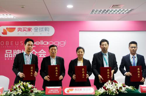 (11月6日,上海)进博会第二天,跨境电商平台奥买家隆重举行“ROBEUS & Bellaoggi品牌推介会”,正式与意大利知名美妆品牌ROBEUS 和Bellaoggi签约,成为两家品牌在中国的独家代理商,共同为中国消费者提供优质的商品及购物体验。当天,奥买家全球购与多家国际供应商达成ROBEUS、Bellaoggi产品采购合作意向,合同金额逾15亿元。奥买家集团总裁刘丽萍、上海跨境电商协会秘书长夏世锋女士、中国意大利商会秘书长Emanuela Vizzarro以及ROBEUS和Bellaoggi品牌负责人出席签约仪式,共同见证这一时刻。