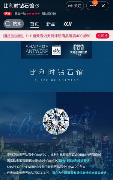 11月6日,阿里巴巴和全球最大钻石交易中心安特卫普钻石交易中心(AWDC)在首届中国国际进口博览会上宣布合作。 赶在天猫双11商业奥运会开赛,AWDC在天猫开了“比利时钻石馆”,售卖专为中国消费者创立的钻石品牌Shape of Antwerp。 目前,全球共有四大最权威的钻石交易中心,包括美国纽约钻石交易中心、以色列特拉维夫钻石交易中心、印度孟买钻石交易中心和这次与阿里巴巴合作的安特卫普钻石交易中心(AWDC)。