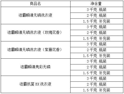 花王(上海)产品服务有限公司(董事长总经理中西稔)宣布,2018年10月全新升级版洁霸瞬清系列洗衣液上市。 【上市目标】 花王集团旗下高端洗衣品牌洁霸自1999年在中国上市以来,一直致力于为广大消费者提供优质产品、丰富的产品线,现有的产品线已涵盖洗衣粉、洗衣液品类。 随着现代社会的生活品质不断上升,消费者对洗衣产品的附加价值诉求也在不断提升,但唯有对“安心、安全”的诉求是一直保持不变的。秉承花王集团“创造优质产品”这一价值观,为了让消费者能使用安全、放心的产品,花王研发人员就洁霸瞬清系列洗衣液的洁净力进一步升级:加入“活力酵素”的成分。该成分能渗入衣物纤维内部,有效针对蛋白质、淀粉等食物污渍,轻松洗净没污渍,效果一目了然。 此外,新升级的洁霸瞬清系列洗衣液采用花王全新弱酸泡沫技术,洗涤时起泡丰富,漂洗时能迅速漂清没有残留(注:无酸性残留),且配方温和不易伤手。为了让消费者在使用洁霸洗衣液时更安心,改良后的产品中不添加荧光增白剂以及人工色素,洁净实力则更为显著。 焕新升级后洁霸瞬清系列洗衣液清洗衣物更洁净,将为中国消费者们带来更好的洁净和安心体验。