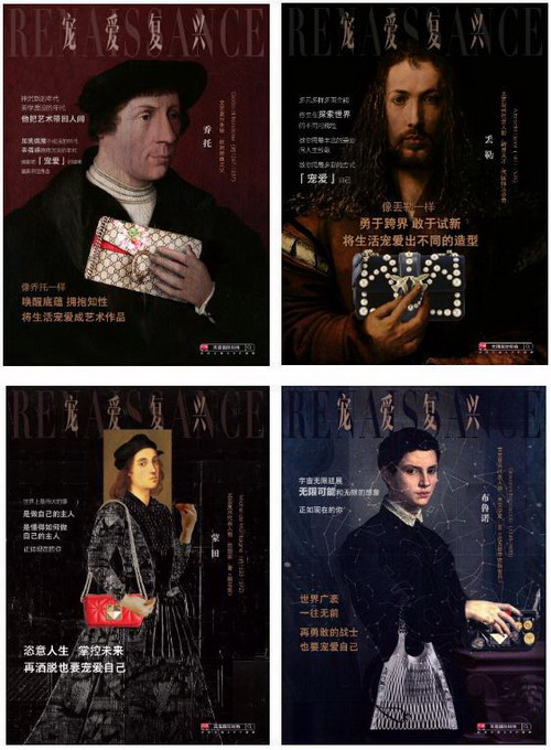 双十一前,天猫国际发布的一组“宠爱复兴”视觉海报引发网友热情关注。海报以文艺复兴各领域代表人物乔托、丢勒、蒙田和布鲁诺等作为画面主体,加之由其个人代表性成就改编而来的“宠爱复兴”宣言,鼓励女性宠爱生活、宠爱自己,对应搭配着包括Sonia Rykiel在内的欧洲大牌女包,不仅意趣饱满,也深具情绪感染力。