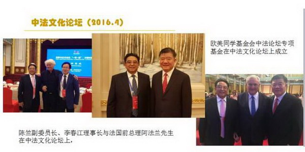 2016年5月日由欧美同学会主办,欧美同学基金会支持的首届中法文化论坛在北京人民大礼堂举行。领导和法国奥朗德总统分别致贺信,对论坛的召开表示热烈祝贺。中国国务院副总理刘延东出席了开幕式并致辞。法国前总理拉法兰,中国全国人大常委会副委员长、欧美同学会会长陈竺出席了开幕活动并先后致辞。