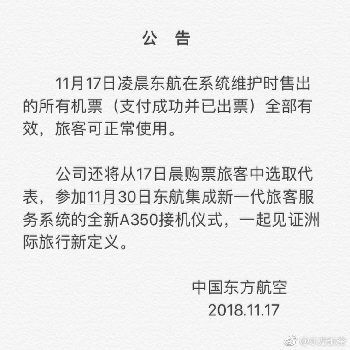 看到这消息,小编第一时间为东航的后台程序员捏了一把汗。不过东航随后出面回应了此事,也让人忍不住为其点赞。东方航空表示,11月17日凌晨东航在系统维护时售出的所有机票(支付成功并已出票)全部有效,旅客可正常使用。同时,东航还将从17日晨购票旅客中选取代表,参加11月30日东航集成新一代旅客服务系统的全新A350接机仪式。 以下为东方航空在官方微博发布的公告全文: