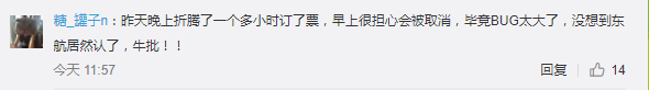 超低价往返头等舱,以及获得参加东航全新A350客机接机仪式的机会,这可真是 “天降锦鲤”了!没赶上这一波的乘客纷纷表示“感觉错过了一个亿”,而赶上这一波幸运bug的乘客则开始纷纷晒截图拉仇恨了。 网友@MU問題先生 则是购买了至少18张机票,并称“夜猫子也有好处啊”。