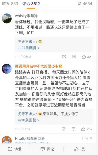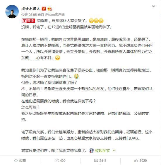 昨晚不求人的直播现场 就在不求人结束比赛后,他立马和粉丝道歉,然后说着说着就哭了。今天一早,不求人也是第一时间更新微博,讲述了自己昨晚输掉比赛的事情。“其实最难过的不是输赢,而是愧对大家一直的努力。”其实,不求人就是觉得对不起粉丝,对不起大家的支持。