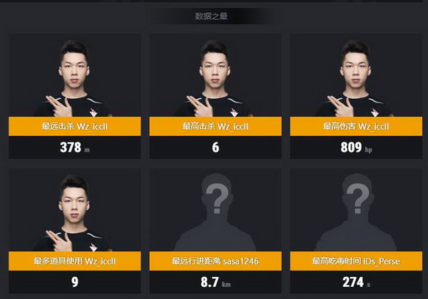 另一边,WZ的队员iccll向观众展现了他的强势刚枪打法,完成12杀位列胜者组击杀榜第二名。同时iccll也是胜者组晋级赛的数据帝,占据了最远击杀、最高击杀等数据之最。凭借着iccll的出色发挥,WZ成功晋级总决赛。