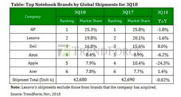 在手机越来越成为当下老百姓不可或缺的工具,功能越来越多,使用场景越来越广阔的当下,无论是PC,还是笔记本电脑,似乎都逐渐被淡化了。不过,作为生产工具,电脑仍然是目前最重要的生产工具之一,其中,笔记本电脑更是其中重要的组成部分。而说到笔记本电脑,可能一般消费者最先想到的几个牌子就是HP、联想(包括ThinkPad)、苹果、DELL、宏碁等牌子,那么目前在这些品牌中,谁家又是这个细分行业的No.1呢?近日,市场研究机构TrendForce公布了2018年度第三季度笔记本出货量排行,从中可以看出,与去年第三季度和今年第二季度相比,排行榜前三的排名并没有变化,依旧是惠普、联想和戴尔。而差距却越来越明显了,曾经的领头羊联想,想要再次登顶的可能性似乎越来越渺茫了,而曾经一度逆袭紧跟前三的苹果却出现了大幅度的下跌,以至于跌出前三只排名第五,而同样出现较大跌幅的还有曾经凭借主板,在大陆蜚声鹊起的华硕。
