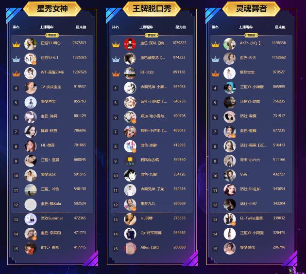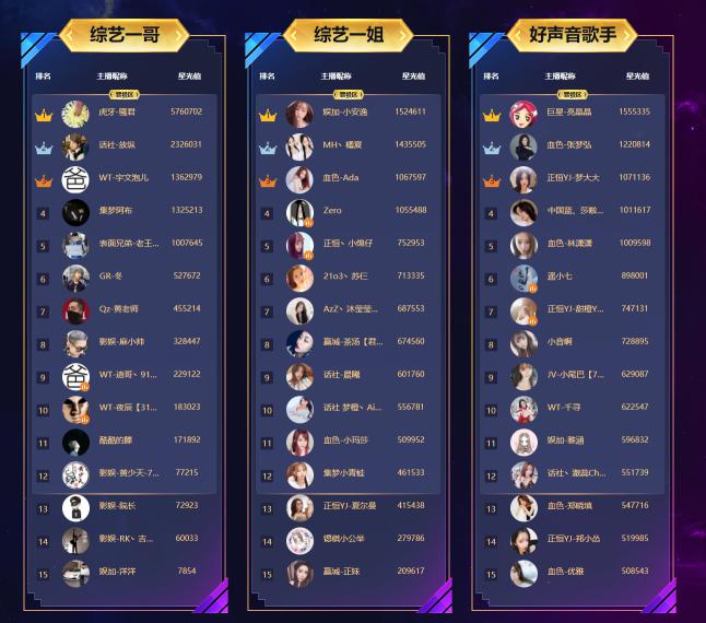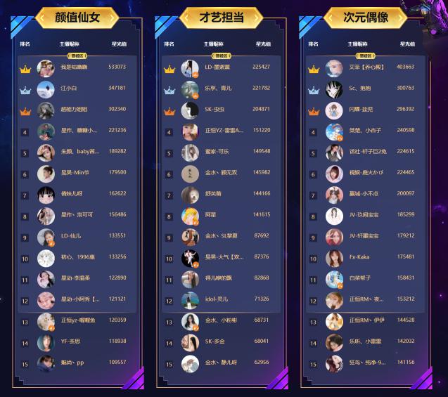 在颜值仙女、才艺担当、次元偶像这三个赛区,我是咕噜噜、墨紫熏和艾菲则分别占据第一名,但是,江小白、超能力姐姐和青儿、虫虫等人气主播的实力也是不容小觑,我们也十分期待她们接下来的表现。