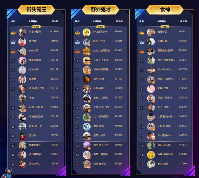 小小小酷哥在街头霸王排行榜上稳坐第一,而洋气黄、户外小易、集梦皮皮熊作为第二梯队也是紧追不舍。野外鬼才和食神赛区,帅比在石和虎牙小丢则位居第一。