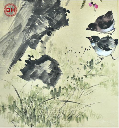 此幅藏品描绘出了一幅动人的花鸟世界,颜色对比鲜明,体态优美飘逸,形色俱若自然,意高韵古。山石斜出,枝干傲然地舒展着筋骨,嫩叶红花,生机盎然,色彩或浓或浅,生动灵妙,颇有俊逸之势。两只小鸟平地漫步,姿态各异,造形严谨,描绘细腻,活灵活现,顾盼之间,让人浮想联翩。这幅作品画得非常细致,叶脉、花瓣、鸟羽等精细之处都刻画得清清楚楚,鸟的精神与花的灵魂让人一目了然,让人叹为观止,兼具非凡的艺术价值和收藏价值。 This collection depicts a moving world of flowers and birds,with contrasting colors,graceful and elegant body,natural colors and high-pitched rhyme.The stone slanted out,the branches stretched proudly and stretched,the young leaves were safflower,the vitality was full,the color was thick or light,vivid and wonderful,quite handsome.The two birds walked flat,with different postures,rigorous shapes,delicate depictions,vivid and vivid,and between the hopes,people think.The painting is very meticulous,and the fine details of the veins,petals,and bird feathers are clearly depicted.The spirit of the bird and the soul of the flower make it clear at a glance,which is amazing and has extraordinary artistic value and collection value.
