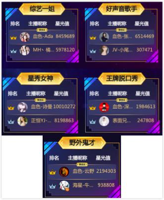 “血色-诗曼”拿下“星秀女神”第一,“星秀女神”的评选可谓战况激烈,虽然第二名累积星光值达到了近820万,但诗曼仍然以180万的绝对领先优势稳稳拿下女神称号。