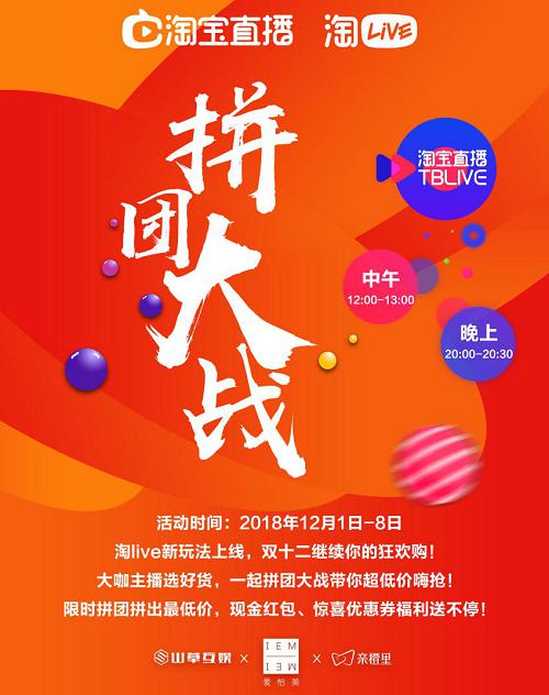 双十一的“剁手大战”已过去半个月,又迎来了双十二淘宝直播新玩法上线!由淘宝直播、淘Live、山草互娱、亲橙里联合打造的双十二互动直播节目《爱怡美·拼团大战》开播啦!此次活动是淘宝直播首次尝试在直播间拼团的玩法,将延续双十一抢购大潮,在双十二继续享受购物狂欢! 此次直播活动在12月1日-8日每天中午12:00和晚上20:00于杭州亲橙里购物中心1F进行直播,采取“线上+线下”的直播形式,由大咖主播担任“团长”,在双十二期间吹响拼团集结号,在直播间分享超低价拼团宝贝,用户可在直播间参与限时拼团抢购,直播间内更有现金红包、惊喜优惠券福利送不停!