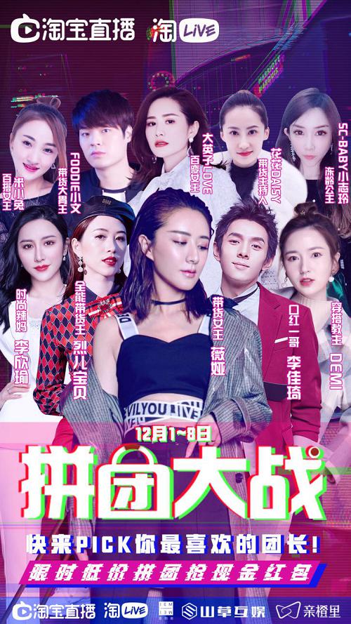 《拼团大战》直播活动共有八个主题,参与拼团的宝贝产品均来自淘宝新兴的产业带,性价比高。直播活动安排如下: 12月1日《全民的女生》 大咖主播:花花Daisy 12月2日《全民的男神》 大咖主播:李欣瑜 12月3日《全民的萌娃》 大咖主播:大英子 12月4日《全民的女神》 大咖主播:烈儿宝贝 12月5日《全民的美食》 大咖主播:Foodie小文 12月6日《全民的潮玩》 大咖主播:李佳琦Austin 12月7日《全民的家》 大咖主播:淘女郎demi 12月8日《全民的颜值》 大咖主播:薇娅viya 晚上20:00-20:30,由主播米小兔、SC-baby小志玲在《宪在出发》、《今晚佼点》栏目直播间持续狂欢。