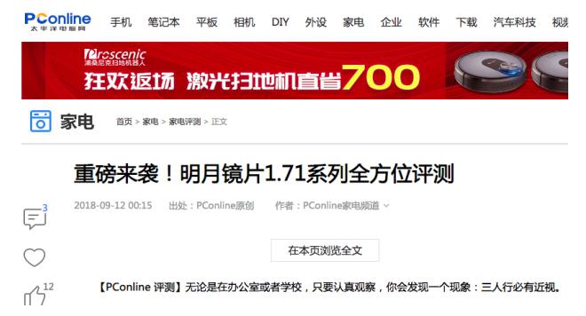 传统时代企业产品的展示和体验相对单一和局限,消费者想深度了解产品的渠道非常受限,互联网的发展则改变了这一现状,在此基础上,众多评测平台应运而生,通过对产品测试评级,给消费者提供购物决策参考,满足人们的体验需求。消费者的消费观念也逐步向追求品质生活的方向改变,在购买决策时越来越偏向拥有更佳使用体验的商品, 镜片作为保障视觉清晰的主角,与我们的眼部健康联系紧密,舒适的佩戴体验尤为重要,全方位的镜片评测成为众多近视用户的追求,以便为配镜提供参考。因此,太平洋、来电生活、极果网等平台纷纷上线镜片评测报告,明月镜片1.71镜片、PMC超亮镜片、防蓝光镜片等产品以近乎“全能”的表现获得一致好评。