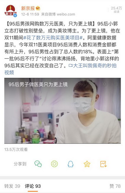 今天,一则95后男生花数万网购医美,只为更上镜的新闻火了。