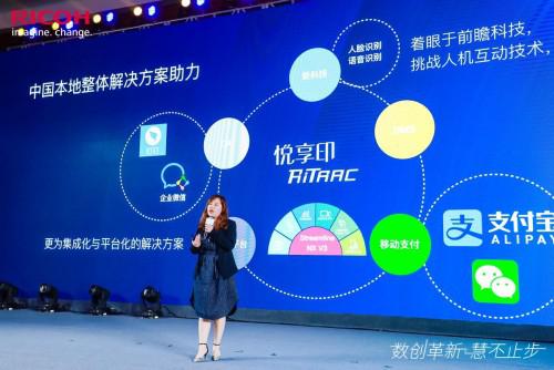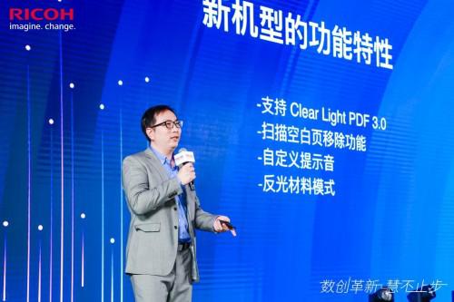 理光(中国)投资有限公司市场部总经理曹昀婷女士 发布会上,理光(中国)领导高层一同为“RiNeo理光数创空间站”揭幕。全新诞生的RiNeo是理光首创的全新一代智慧应用平台,通过版本升级的方式,在为用户的设备带来常规固件更新的同时,提供高附加值的功能应用程序。这是继理光2017年发布“SOP智慧应用平台”之后的又一颠覆性的创新,标志着理光(中国)在智慧办公的技术开创与市场引领方面再创新辉煌,为客户带来更加智慧化、便利化的办公文印体验。