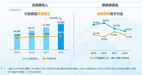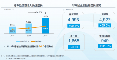 根据中国大地保险发布的2018年度报告,2018年中国大地保险实现保费收入426亿元,同比增长14.2%,行业排名跃居第五。至此,中国大地保险已经实现保费增速效益连续四年保持双优。市场份额也由四年前的3.16%上升到3.6%,实力进一步提升。 分析中国大地保险保费增速快速增长原因,可看到科技转型对业务结构的优化作用。伴随着科技转型的逐步深入,中国大地保险的转型成效逐渐显现,业务架构不断趋向合理,规模、效益、合规风控均优于市场。其中非车险保费收入同比增长54.5%,增速大幅领先市场。