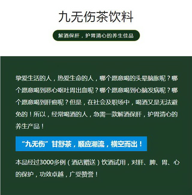 产品配方简介药食同源,天然安全葛根历代中医典籍文献,都有记载葛根的解酒功效! 唐代《药性论》云:“葛根开胃下食,主解酒毒”...... 唐代《本草拾遗》云:“葛根解酒毒,小便赤涩”...... 明代《本草纲目》云:“葛根解酒毒,除烦止渴”...... 但是,葛根的生长区域非常大,从东北三省到广东、广西的二十多个省区都有栽培,由于各地的气候、土壤、环境的不同,葛根中的解酒成分的含量也是千差万别的!并不是所有的葛根都有解酒功效!通过我们检测得知,广西产的葛根,以根块肥大,粉性足,纤维少、质地坚实,有效成分含量高,为最佳解酒品种!为了确保产品功效,我们专人采购广西葛根用做原料。 本品所用原料,皆选用道地所产,通过现代工艺制成方便服用的袋泡茶,口味清香怡人,边喝酒,边饮茶,在不知不觉中解除了酒精对我们的肝、脾、胃、心的伤害,简单、方便、有效!真正达到“世人皆醉我独醒”的境界! 粉干姜:味辛性温 功效:温中散寒,腹疼吐泻,开五脏六腑,去腹胀冷疼...... 新会皮:味甘性凉 功效:醒酒化痰,酒伤口渴,饮食失调,腹胀烦满。 唐末五代时《日华子本草》载其:“皮炙作汤,可解酒毒,治酒渴”...... 云苓:味甘性平 功效:益脾和胃,渗湿利水。 《日华子本草》谓其:“补五劳七伤,开心益智,宁心安神”,云苓能快速的把酒化之水排出,保护肝脾胃心不受酒害! 本产品的功效:解酒保肝,护胃健脾,清心宁神。治酒伤胃疼,腹胀呕吐,心神烦乱,胸膈痞塞,手足颤摇,二便不利,酒醉口渴,头晕头痛,二目昏花,饮酒成癖。 酒前、酒中、酒后,皆可泡饮,每次2包,冲泡3-4次更换茶包,平时也可以保健饮用,持续清理肝中酒毒,保护胃黏膜。长饮此茶,还你一个健康的肝、脾、胃、心! 中国首席商业资讯门户;更多内容请关注中国商业网各频道、栏目资讯。 免责声明:凡本站注明 “来自:XXX(非中国商业网)”的新闻稿件和图片作品,系本站转载自其它媒体,转载目的在于信息传递,并不代表本站赞同其观点和对其真实性负责 。 |