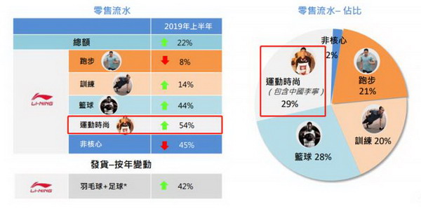 三、品牌推广“效果显著” 年轻化形象“深入人心” 在中期报告中,李宁总结,收入上涨的主要原因之一,是通过有效地将中国元素与自有“体育基因”相融合,李宁品牌的认同度显著提升。而这一契机要从去年说起。 18年二月,李宁首登纽约时装周,迎来了又一突破点。由此,李宁便开始利用国际时装周一路打开局面,频现巴黎时装周、纽约时装周,以国潮时尚刷新外界对李宁的印象。 与此同时,李宁公司业绩一路走高,时隔8年首破百亿。2018年集团收入同比增长18%至105.11亿元,实现从陷入谷底到逆风翻盘。 近几年,国潮已经成为了年轻人的新消费选择。根据某咨询机构发布的《2019年中国消费者趋势》,78.2%的消费者经常购买国货,并且,在同等价格下44.6%的消费者更倾向于购买中国本土品牌。 除了产品,李宁的整体渠道架构也在不断优化。集团将部分原自营店铺转接给经销商经营,并同意经销商开设大店、时尚店,使特许经销商收入录得40%中段增长。上半年整体同店销售2019上半年录得10%至20%中段增长等一系列指标反映出零售运营效率有较大提升。 李宁目前的主要渠道包括高效店、中国李宁及潮店、专业运动店和清货渠道。李宁时尚线对于线上与线下的渠道布局也开始向多种形态延展。电商也已经成为李宁增长最快的渠道之一,中期财报显示,电子商务渠道收入占比持续上升,增速录得30%高段增长。 与此同时,李宁对体育赛事赞助与营销的推进也表现出极高的专注。2019年,包括对CBA职业联赛、韦德中国行、CJ•迈克勒姆中国行、3+1篮球联赛、青岛马拉松等赛事赞助,推动中国乃至全球体育事业的发展。 “在消费结构日趋优化的进程下,我们预期民众的消费需求更趋精细和多元化,为顺应行业趋势,在多变的市场环境中创造成功的生意机会,我们将继续以产品为核心,巩固品牌力,深化李宁式体验价值。未来,我们仍将主要资源投入到运动知识学习、运动科技研发和打造李宁品牌体验上,积极寻找及拓展更多业务发展空间。”关于未来,李宁先生这样表示。目前,国内运动品牌,在中高端价位段能实现稳定商业化规模的,只有李宁。 四、专业产品 “匠心之作” 时尚产品 “赢得民心” 衡量体育用品公司最核心的两个能力在于:运营能力(终端零售+ 供应链管理)+ 产品持续打造能力(设计+功能性创新)。时尚易变,但功能永恒。李宁这一轮强势增长的背后,最难能可贵的是,没有因为时尚线的井喷式增长而选择性忽略专业性产品的拓展与开发。运动产品最核心竞争力为围绕功能性的产品研发和打造能力。李宁在过去五年中已经在运营方面建立起深厚的壁垒,体现在极强的终端零售管理能力和供应链把控能力。而在最近两三年里,李宁的产品和品牌端正迎来显著改善和提升的最好契机。 在产品方面,李宁聚焦篮球、跑步、训练、羽毛球及运动时尚五大核心品类,满足消费者对各品类功能性的差异化需求。今年上半年,李宁篮球品类零售流水上涨44%,占28%;包括中国李宁的运动时尚零售流水大涨54%,占29%;李宁跑步品类零售流水下降8%,占21%;训练类零售流水上升14%,占20%。这意味着,李宁核心品类均是20亿以上的生意,已站稳脚跟。其中包括中国李宁在内的运动时尚品类服装系列2019上半年总销量超过520万件,新品售罄率超过60%,鞋系列上半年售出超过4万双。 2019年1月25日,“李宁䨻”轻弹科技平台正式亮相,兼具“高效回弹”与“轻量化”两大特性,为李宁自主科技矩阵带来重要革新。“李宁䨻”系列产品将覆盖跑步、篮球、羽毛球等全品类,应用于专业鞋产品的中底设计中,为运动员及广大运动爱好者提供更专业的产品体验。对李宁来说,主打功能性的专业运动品类,需求更稳定,生意更稳健,这都增强了李宁未来业绩的可持续性。 19年3月,李宁在坚持专业运动定位为核心的同时,将时尚作为独立业务进行发展。时尚已经成为李宁收复曾经江山的一把利器。并且,李宁运动时尚化的策略日渐清晰,其中要义就是通过强化“中国李宁”的国货属性,对运动鞋和运动服饰进行时尚化、潮牌化升级。李宁公司在中期财报中表示,集团将强化专业属性、捕捉潮流元素,进行产品力升级。聚焦核心品类,全方位深化营销布局。 纵观国际运动品牌巨头,无论是耐克还是阿迪达斯都始终紧紧围绕产品功能性做长期、大规模的研发投入,每年源源不断上新兼具功能性和时尚性的爆款产品,不断吸引消费者和强化消费黏性。我们同样看到李宁在产品打造方面的数年深耕逐渐步入收获,其中最为明显的是产品功能性和外观设计共同提升,品牌价值不断增强。而产品打造能力的壁垒一旦建立,将会伴随研发的持续投入不断巩固。 后记:500亿市值后 李宁公司上限远未到来 进入2019年下半年之后,体育用品行业复苏势头仍在延续,大多本土运动品牌公司也正处在深度调整和加速转型升级的过程中,部分公司通过不断调整品牌战略,加大品牌建设力度,探索新的产品开发和营销模式,已逐渐找准方向,重新进入到规模扩张轨道,强者愈强的马太效应显露无疑,行业集中度也不断提升。 随着体育产业的不断变革以及政策红利的逐步释放,运动品牌或将面临一个新的增长期。在业绩整体向好和分化的行情下,本土运动品牌企业均在加快调整、优化和转型的步伐,而那些有优势产品、有切合自身发展的商业模式以及成熟的