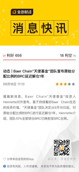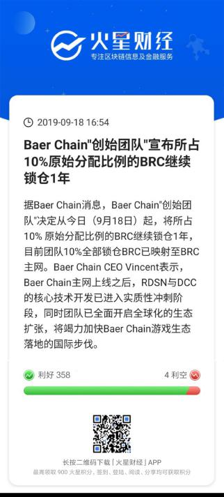 Chain CEO Vincent同时表示,Baer Chain主网上线之后,RDSN与DCC的核心技术开发已进入实质性冲刺阶段,此外团队已全面启动全球化的生态扩张,竭力加快Baer Chain游戏生态落地的国际步伐。 在项目方宣布锁仓延长一年后,Baer Chain"天使基金"投资人Henriette立马对外宣布,基于持续看好Baer Chain生态的投资价值,"天使基金"团队决定从即日(2019年9月18日)起,对原始分配比例(10%)的BRC进行延迟解仓1年。据Henriette介绍,团队10%全部锁仓BRC也已映射至BRC主网。 Baer