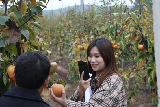 京东直播的主播们走进果园,为线上粉丝现场直播黄金梨采摘过程