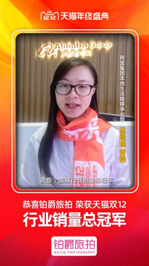 阿里集团本地生活服务婚假事业部总经理 青韫 恭贺铂爵旅拍荣获双十二行业销量总冠军