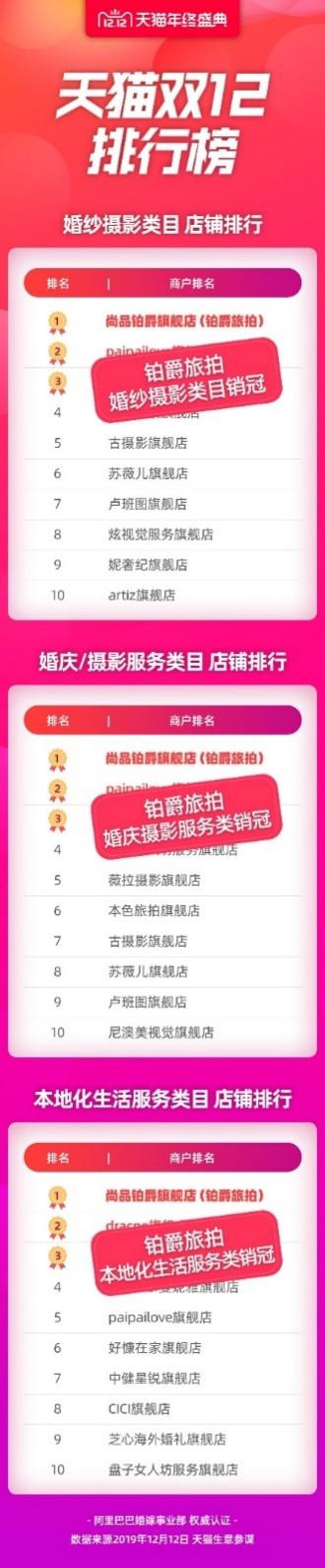 天猫婚嫁事业部最新数据显示,铂爵旅拍“双十二”再获销量冠军,坐稳天猫“双十二”“三冠王”宝座,领先第二名1.8倍。铂爵旅拍引领了传统行业天花板的突破与细分蓝海市场的开拓。纵观市场,铂爵旅拍已成为“幸福”产业的独角兽。