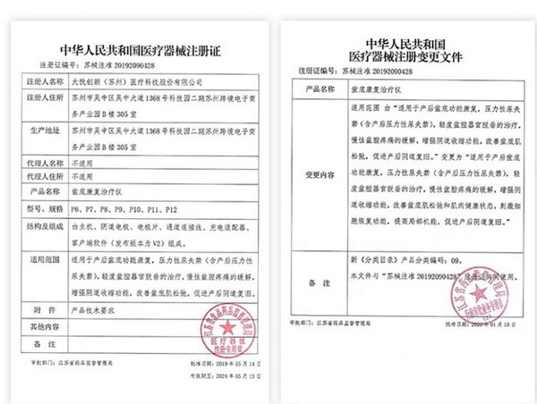 目前,大悦医疗自主研发、生产的产品--大悦盆底康复治疗仪,已成功上市销售。 大悦盆底康复治疗仪属于国家二类医疗器械,并成功获得由江苏省药品监督管理局颁发的国家二类医疗器械注册证。 这是国内首张具有“增强阴道收缩功能,改善盆底肌松弛和肌肉健康状态,促进产后阴道复旧”的国家二类医疗器械注册证,对女性生殖系统康复领域“既要注重形态恢复,也要重视功能康复”的理念转变提供了安全有效的解决方案支持。 2020年1月,大悦医疗收到了医疗注册证的变更文件,扩大了大悦盆底康复治疗仪的适用范围,调整为适用于:产后盆底功能康复,压力性尿失禁(含产后压力性尿失禁),轻度盆腔器官脱垂的治疗,慢性盆腔疼痛的缓解,增强阴道收缩功能,改善盆底肌松弛和肌肉健康状态,刺激细胞恢复功能,提高局部机能,促进产后阴道复旧。