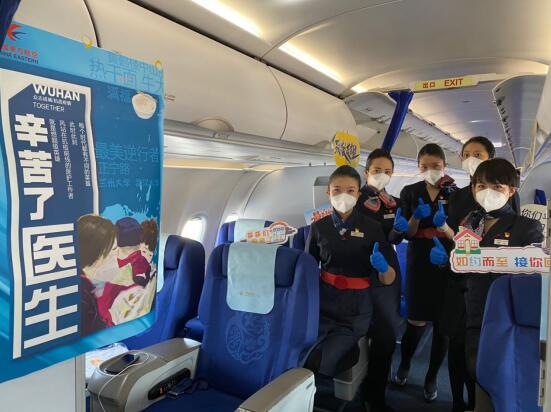 接到此次包机任务的消息,东航很多飞行员、乘务员主动请缨,强烈请求安排自己执行接医护人员回家的包机任务。“我们如约而至,接你们回家”“心手相连,共克时艰”“辛苦了,勇士们”在6个不同的东航包机航班上,所有的东航机组人员都怀着激动的心情迎接英雄们登上飞机。每一次的鞠躬致敬,每一个带着笑脸的口罩,每一颗双手比出的爱心,每一个关心的眼神交流,都饱含着激动与安心,代表着深深的感动、感谢与致敬。东方航空官方微博特地为迎接抗疫英雄回家打出了一张特别的“纪念登机牌”,从英雄的城市起飞,报以“仁心厚德”,带着“惟愿岁月无恙,同享时光美好”的美好祝福回“家”,这是对抗击疫魔、守护山河的白衣天使们最诚挚的感谢与最崇高的致敬。 如同当天机上广播中所说的那般:“过去这一个多月,中国人用举世瞩目的效率和速度,走出了疫情的至暗时刻,迎来了生机勃勃的明媚春光。能够履行约定,在杏林春暖之时接你们回家。请允许我们代表东航全体人员,向你们真诚道一声谢谢!幸得有你,山河无恙!致敬每一个守护生命的抗疫英雄!” 根据计划,3月18日,东航还将执行陕西省第三批医疗队、中医医疗队共计170人及安徽医大一附院137人等援鄂医疗队分别返回西安、合肥。 自新冠肺炎疫情发生以来,东航第一时间全力保障全国各地医疗队伍和防疫物资到达抗疫一线,全力打通、实时畅通全球、全国各地驰援疫情防控阻击战第一线的“空中生命通道”。从除夕夜执行全民航首班援鄂医护人员包机任务以来,截至2月25日,东航已执行国内外援鄂包机任务96班,累计运送了上海、山西、陕西、甘肃、江苏等省市的共9610名医护人员,从泰国等地共接回539名滞留境外湖北籍同胞回家,是中国民航驰援包机运输量最大的航司,占全民航驰援武汉医护人员包机运输量超过40%。