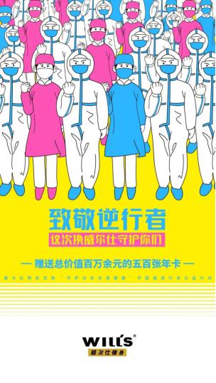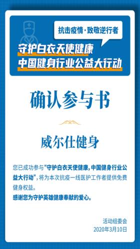 在CHINA FIT健身大会、懒熊体育、练吧•场馆吧联合携手北京常春藤医学高端人才联盟发起的“守护白衣天使•中国健身行业公益大行动”中威尔仕健身就作为特别支持场馆重磅加入爱心阵营,为抗疫一线工作者赠送了总价值百万余元的健身关爱年卡,参与的门店超100家。