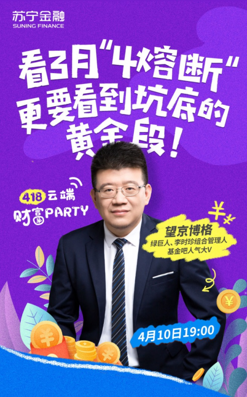 后疫情时代,社会各界都在致力于打赢经济保卫战,投资市场逐渐升温。为了让大家能够GET到更多投资诀窍,苏宁金融418云端财富PARTY特意邀请了一位擅长长期投资和挖掘低估值宽基指数的大咖,他就是绿巨人、李时珍组合管理人,基金吧人气大V 望京博格,在4月10日19:00的直播中,他将结合近期市场环境分析,与大家分享指数基金投资秘笈。