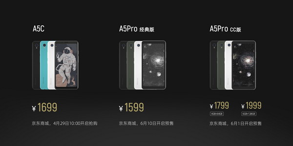 据了解,本次推出的新品将在京东商城开启首销,其中A5C售价1699元,4月29日10点京东商城开启抢购;A5Pro经典版售价1599元,6月10日起京东商城预售;A5Pro CC版4GB+64GB版本1799元,6GB+128GB版本1999元,6月1日起京东商城预售;护眼平板Q5售价2299元,6月10日开启全网预售。