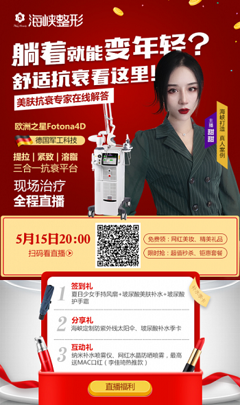 奥黛丽·赫本曾说过,外貌是每个女人不可或缺的资本,外在决定两个人在一起,而内在可以决定两个人在一起有多久。口红、包包等这些附属品终究都会被时光打败,然而一张无关岁月永葆青春的脸,才是一个女性最高级的性感。 女人在25岁以后,胶原蛋白开始快速流失,脸部老化松弛下垂,皮肤细纹松弛在第一个时间点就会透露出年龄的小秘密。抗衰老从年轻时就要开始,在肌肤出现状况前及早延缓老化。刷新颜值的新主角欧洲之星Fotona 4D的出现,实现了抗衰提拉紧致的效果,让女人的年龄成为秘密。 找过郭俊龙院长面诊治疗的求美者应该都知道,郭院长的医学美肤技艺水平超高,每天都有不少有皮肤美容方面诉求的顾客来跟我们预约郭院长的治疗。5.15日这次直播邀请到的就是郭俊龙院长,他会带你了解多大年龄做抗衰效果才更好、美肤抗衰项目到底该怎么选择、Fotona 4D原理和治疗特点有哪些,医生的线上指导、案例展示、治疗实操的过程全部都能在线上看到! 关于直播的主要内容都给你整理好啦,直播期间济南海峡整形医院还给大家准备了超强福利!心动不心动!!!赶紧收藏下面的信息,以免因为忘记而错过这么精彩的直播哦~ 直播时间:2020年5月15日20:00 直播地点:济南海峡美容整形医院二楼美肤治疗室 直播人员:海峡网红主播耿甜甜、郭俊龙院长 直播福利: 1、直播秒杀:300元秒杀欧洲之星Fotona4D 3000现金抵用券,再送BOTOX单部位除皱1次;更多热门抗衰项目超低价抢购。 2、签到礼:直播间签到互动即可免费领取夏日少女手持风扇+玻尿酸美肤补水+玻尿酸护手霜。 3、分享礼:观看过程中分享直播链接到朋友圈,截图发直播助理/客服即可来院领取海峡定制防紫外线太阳伞、玻尿酸补水季卡。 4、互动礼:观看直播时互动最多的,主播可多轮陆续送出纳米补水喷雾仪、网红水晶防晒喷雾、玻尿酸次抛原液,最高者送MAC口红。 躺着就能变年轻?舒适抗衰看这里!让我们一起看直播,拿礼品,赢大奖!!!超值秒杀名额等着您,快快锁定直播间吧!5.15日晚20:00,我们不见不散。
