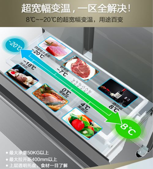 保鲜食材不仅要保湿,更要做好除味和杀菌。想要食物不串味,还在切柠檬、放柚子皮吗?不用麻烦啦,伊莱克斯健康新格局对开门冰箱将净味除菌一步搞定。搭载TMS氧催化净味系统,生物净味安全安心,保留食物最初的味道,剩菜剩饭一起放也不怕;同时配备NOS负离子除菌系统,无味的同时还保证了无菌,闻着舒心吃着放心。保湿净味除菌三重技术相互配合,伊莱克斯新品对开门冰箱以“系统养鲜”技术专注守护您的饮食健康。 健康新格局 超宽幅变温室,随季而动 随食调节 相比传统对开门冰箱,伊莱克斯深深了解厨娘煮夫们的痛点,稍微大一点的食材没地方存放,只能改刀“变身”,不仅破坏了食物原有的形状更加速了腐败的进程。伊莱克斯新品对开门冰箱实现了技术的重大突破,全新升级“新格局”,在原来对开门冰箱的基础上增加了一个-20℃~8℃的超大变温室。