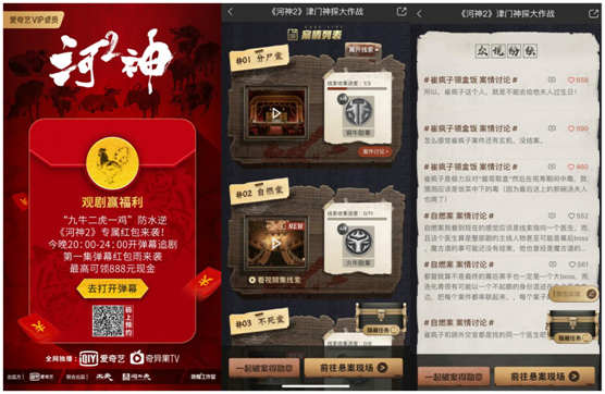 爱奇艺系列自制剧《河神2》正在热播,剧中悬念迭起的迷案剧情、恢弘精细的内容制作和创新沉浸式追剧玩法多次引发广泛热议。目前该剧在爱奇艺站内内容热度峰值突破7000,并持续登上骨朵、猫眼、Vlinkage等多榜榜首,获得85%的知乎网友推荐,微博话题#河神2#阅读量突破9亿。 在《河神2》内容升级的基础之上,平台为该剧量身打造的弹幕红包、为角色打call、探案成就系统等全新互动玩法,也打开了类型剧的追剧新视角,拓展了剧集内容的互动、社交属性。 为了增加追剧热情,《河神2》开播日为用户派送追剧福利,只要打开弹幕就能开启红包雨。同时,在不影响观剧的前提下,用户可以点击屏幕下方链接打开“为角色尖叫打call”的活动页面,投喂头饰、眼泪等道具为喜爱的角色助力,更即时、顺畅地表达对于角色和剧情的情绪。目前,剧中角色丁卯以超72万的分贝值登陆榜首,最终统计之后,助力用户还有机会获得《河神2》的精美周边。 除了派发福利、帮助用户跟角色互动,爱奇艺《河神2》更开发了一套线上探案的成就“系统”,为用户提供了全新的沉浸式追剧体验。用户观剧过程中,可随着剧情进展,在特定时间点自动激活与“九牛”、“二虎”、“一鸡”紧密关联的案件,开启“津门神探大作战”收集线索和勋章的探案之旅,活动页面的案情讨论区,也吸引了很多用户发表缜密生动的讨论,完成了追剧、互动、社交的闭环打造,开启了悬疑剧从“看”到“玩”的体验转变,通过更有趣的互动方式增强追剧的沉浸感,也以此增强了互动向内容的回流。 爱奇艺此次在成功开发好故事的基础上,又针对优质剧集创新进行运营和营销方式的挖掘,打造出与内容深度绑定的新互动玩法,开辟了用户与内容交互的新渠道,同时也探索出互动层面的新形态,开发了强互动反哺内容的新窗口。