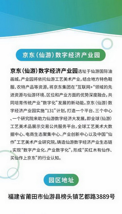 为营造优质消费环境,助力仙游县经济复苏。2020年8月13日至17日,在仙游县商务局、仙游县文旅局、仙游县工艺办的指导下,由京东(仙游)数字经济产业园、莆田供应链管理有限公司、仙游国际油画城联合主办,由仙游侠客岛企业管理合伙企业(有限合伙)、福建省油画行业协会等单位协办的首届仙作文化节,在京东(仙游)数字经济产业园圆满落幕。通过仙作文化与夜摊经济、线上直播、“百企千品”理念的全面融合,形成线上+线下、产业+科技、云业态+新营销、沉浸式体验+场景化销售的全闽乐购现象。