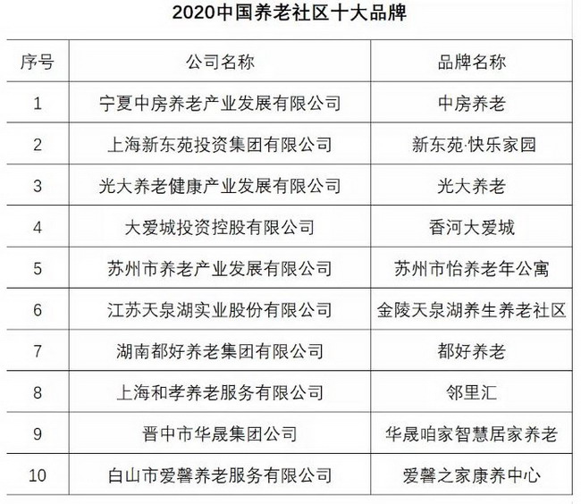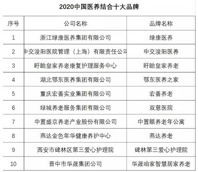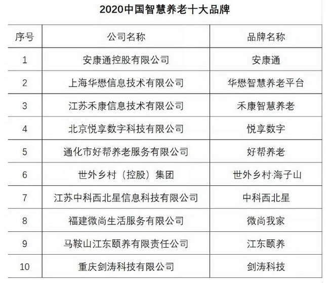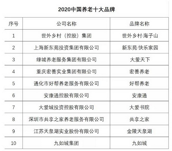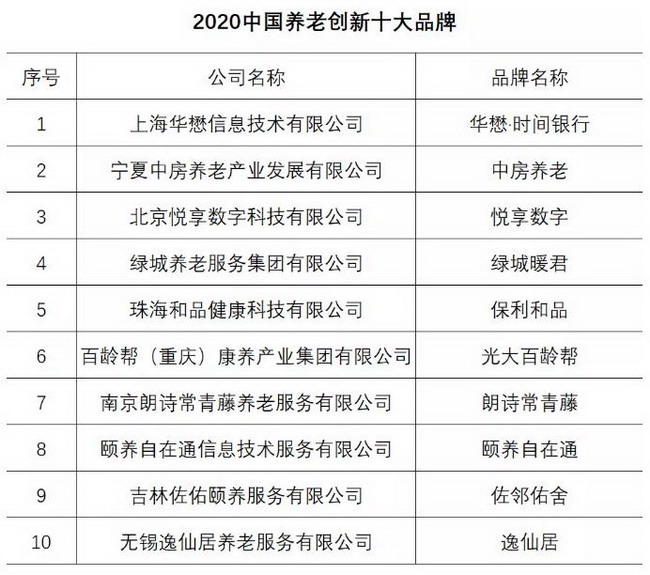 全国老龄办原副主任为品牌代表授牌 凝聚品牌力量,推动产业发展,在中国搜索、中国报道网等中央级媒体的支持下“中国养老十大品牌”系列活动连续举办多届,目前是我国健康养老产业重要的品牌活动。品牌建设是养老产业发展的重要内容,对于企业发展也有着非常重要的意义,树立优势品牌,是促进养老产业发展的有效方式,是弘扬养老正能量,加强养老品牌建设的重要举措,是积极发展老龄事业和产业的具体行动,为中国养老品牌点赞,为中国养老产业加油! 2020中国养老十大品牌,共计有331个养老品牌参加活动,2020年8月,在16天的公众投票时间里,共计累计收获点赞3782134赞,点赞页面访问量:10789011人次,结合中健联盟产业研究中心的专业评测以及专家评审,综合评测,2020中国养老十大品牌正式发布,央视频、第一视频、抖音、有赞等直播平台同步直播颁奖仪式,我们来看看今年哪些养老品牌入选:
