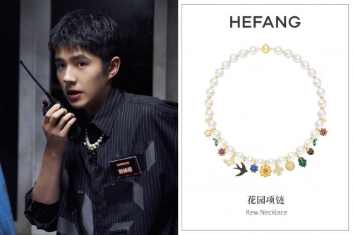 昊然弟弟在密室大逃脱里的这个搭配真的有惊到我。穿着黑色竖条纹衬衫,将HEFANG这款珍珠元素的花园项链佩戴在衬衫领外,巧妙细节瞬间点亮全身搭配。