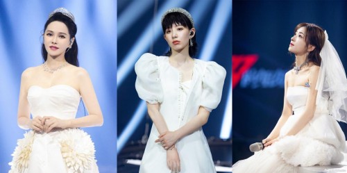 《乘风破浪的姐姐》张含韵 张含韵选择了干净极简的抹胸婚纱,搭配HEFANG家细节满满的花边手镯和冰霜戒指,散发着清甜浪漫气息,在舞台上闪闪发光。