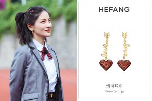 穿上学生制服 ,少女依然。耳边的HEFANG情诗耳环,以丘比特爱神之箭勾勒出的LOVE一箭射中扑通扑通乱撞的心,像极了年少时的怦然心动。