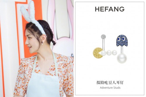 左右不对称设计的HEFANG探险吃豆人耳钉,搭配兔耳朵发饰,可爱满分。