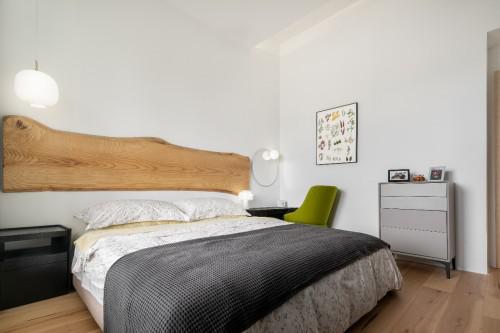 设计师拆除了之前的隔断柜,让用餐空间不再阴暗逼仄。可伸缩的四人位餐桌,打造出灵活的用餐区,与白色吊灯和绿植,让整体氛围更自然、空间更具层次感。 主卧空间: