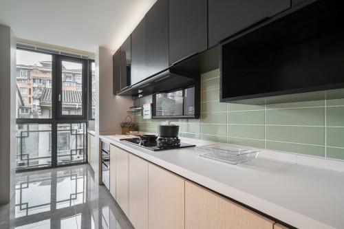 拆除原本的窗户和橱柜,改造为备餐动线更流畅的一字型厨房。而加高的地柜、加长的吊柜,充分扩大了厨房的储物空间。 阳台空间: