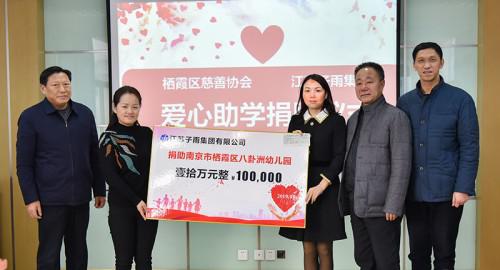子雨集团的公益活动不仅仅体现在“尊老”方面,也体现在“爱幼”方面。董事长孟雷心系教育事业,子雨集团在孟雷的带领下多次获得了江苏南京栖霞区政府颁发的“支持教育先进单位”。2019年1月16日,子雨集团通过南京市栖霞区慈善协会为八卦洲幼儿园捐赠了10万元,用于八卦洲幼儿园助教项目,精准助力困难地区基础教育,改变困难地区的教育现状,推动困难地区的教育质量——特别是学前教育质量的提升,帮助孩子们创造更美好的未来。