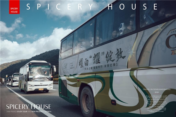 下午2点,芳香世家版纳之行的全体家人前往草坪进行千人傣伞合影,为了更好地服务现场的家人,我们包下数十辆大巴车,车身车体的logo全包设计,使得整个车队看起来格外耀眼,我们出发啦: