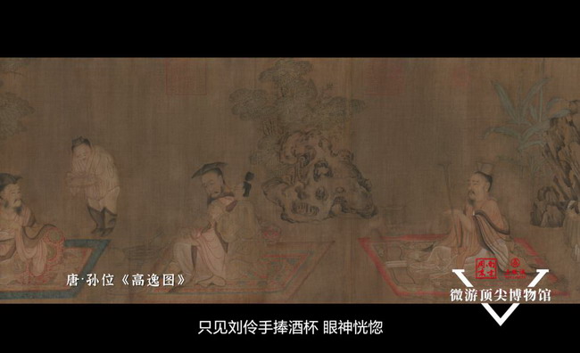 他们传奇的诗酒人生可以从孙位的《高逸图》寻觅。画中四位文人高士体态神情各异,只见刘伶手捧酒杯,眼神恍惚,正作回顾欲吐状,旁有童子持唾壶跪接。而《高逸图》中所描绘的酒器显示出唐代器具的风貌。一位好酒闻名、醉意人生的诗人形象跃然纸上。 “随物赋形,尽水之变,号称神逸”,以上两件画作不仅道尽了文人画重写意的精髓,更为我们展现出文人豁达超脱的人生,它们既是中华酒文化的灿烂瑰宝,也是中华文脉的沉淀与见证。