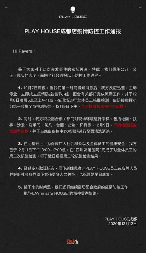 12月12日,PLAY HOUSE成都店方发布公告,表示疫情发生以来:12月8日凌晨完成全体员工核酸检测, 12月9日下午,全员核酸检测报告为阴性。同时,于12月11日下午完成全员第二轮核酸检测。 据公开信息,12月7日晚,PLAY HOUSE关注到朋友圈流传的关于赵姓患者活动轨迹截图,高度重视并现场成立防控指挥小组,配合有关部门完成赵姓患者在PLAY HOUSE的活动轨迹确认,确认该患者于12月6日凌晨3点50分至4点25分的PLAY HOUSE活动轨迹。此前该赵姓患者活动轨迹复杂,曾到访过中冶中央公园、嗨蓝调美甲店、小巷巷麻辣烫、海雾里小酒吧、PLAY HOUSE酒吧、赫本酒吧等。 PLAY HOUSE公告表示:已积极配合相关部门对现场环境进行采样,包括地面、扶手、沙发、洗手间、茶几、台面、货物、杯具等,12月9日,环境检测报告全部为阴性。并于当日晚上由疾控中心对现场进行全面清洗消杀。 同时,PLAY HOUSE回应,网传赵姓患者非PLAY HOUSE员工或应聘人员,并呼吁社会各界给予女孩更多人文关爱,也祝愿她早日康复。 至于开业时间,PLAY HOUSE表示,为确保广大社会群众及全体员工的健康安全,已开展第二轮核酸检测,先继续密切配合政府的防疫工作,把“PLAY in safe HOUSE"的精神贯彻始终。 中国首席商业资讯门户;更多内容请关注中国商业网各频道、栏目资讯。 免责声明:凡本站注明 “来自:XXX(非中国商业网)”的新闻稿件和图片作品,系本站转载自其它媒体,转载目的在于信息传递,并不代表本站赞同其观点和对其真实性负责 。 |