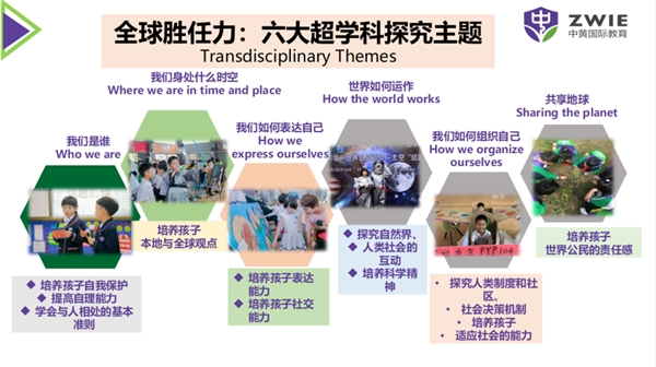 六大超学科探究主题 比如在今年疫情期间,中黄管理的广州市白云区中大附属外国语小学和中黄外国语小学将“疫情”作为教育素材和契机,以“疫情对人类社会造成的影响”为中心思想,学生围绕“新冠肺炎爆发的原因”、“疫情对自然界和人类社会发展的影响”、“人类应该对疫情承担哪些责任?”等探究线索,通过查找资料,用思维导图分析新冠病毒特点;分析世界重大疫情事件;分享如果我是决策制定者,面对类似的疫情,我要采取什么样的防疫措施。从低年级到高年级在内容上、难度上、素材上、形式上、理解的深度高度上比上一次加深递进,呈螺旋上升。学生们通过借助生活中的真实材料,在自主探究学习中,发展信息素养、解决问题的能力、批判性思维、社会责任感和公民意识,从关注个人生活、国家到关注全球人类命运共同体,在本地与全球背景下的探究中培养国际情怀,真正做到学习来源于生活服务于生活。 提升全球胜任力可以通过哪些方法? 从“教”与“学”的角度,培养学生的全球胜任力,教师也必须具备对应的教学胜任力,学会采取有效的教学方法,比如探究式学习、概念理解式学习、合作式学习、全球背景下学习等都是我们中黄教师常用的教学策略,帮助学生消除学习障碍,营造激发学生内驱力,发挥自身创造力的学习环境。