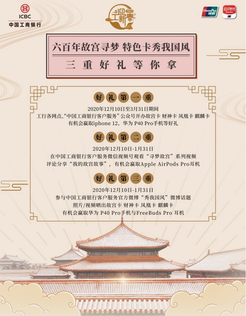 历史文化传承,时代流行创新。银行卡也要有中国特色、风格与气派。工商银行以中式哲学美学元素为素材,使用高级制卡材质工艺,自2018年起陆续推出“紫禁城建成600年纪念卡”、“故宫春夏秋冬卡”“财神卡”、“凤凰卡”、“麒麟卡”等储蓄卡。工行通过文化金融跨界创新,让深植丰厚文化内涵的金融产品走进大众生活,让优秀传统文化融入新时代文化自信。 美好中国,打动世界。故宫储蓄卡因其最具创新性技术与设计成就获得了国际制卡商协会(ICMA)2020年度“依兰奖-独特创新奖”。 自2020年12月到2021年1月底,工行针对的故宫卡及国风特色卡,在“中国工商银行客户服务”微信微博公众号发起 #寻梦故宫##秀我国风#系列有奖互动活动。 活动之一:“寻梦故宫”系列视频,讲出“我与故宫的故事” 2020年12月9日-2021年1月7日,“中国工商银行客户服务”微信视频号播出5集“寻梦故宫”系列视频,介绍故宫相关有趣知识。观看并评论写下“我与故宫故事”,将有机会获得精美礼品。 活动之二:“秀我国风”拍卡晒卡 2020年12月10日-2021年1月24日,发挥创意拍摄工行故宫卡国风卡的照片或视频,在“中国工商银行客户服务” 微博发现页搜索#秀我国风#话题,发布图片或视频有机会赢得大奖。活动共6期,每周1期,详情可查询中国工商银行客户客户官方微博。 活动之三:办卡有奖 客户于2020年12月10日至2021年3月31日在工行网点或“中国工商银行客户服务”公众号开办并启用故宫卡或国风特色卡(财神卡、凤凰卡、麒麟卡等)。在 “中国工商银行客户服务”微信公众号发送#寻梦故宫#或#秀我国风#关键字,即可进入报名渠道,参与大奖抽取。 (特色储蓄卡:故宫卡、国风卡) 有颜值有文化 快把旧卡换新卡 工行此次三重好礼活动主要围绕故宫卡、财神卡、凤凰卡、麒麟卡展开。每一款卡都是兼具金融功能与美好寓意的储蓄卡。既是银行卡又是护身符。 紫禁城建成600年纪念卡 2020年是故宫建成六百周年,工商银行与故宫博物院合作发行“紫禁城建成600年纪念借记卡”产品,分别为“星耀八方卡”与“太平有象卡”。 (从左到右:故宫600年太平有象卡、故宫600年星耀八方卡、财神卡尊享版、凤凰卡尊享版) (左:故宫600年星耀八方卡、右:故宫600年太平有象卡) “星耀八方卡”卡面的北极星(紫微星)是紫禁城的命名来源,是中华文化最悠久的文化符号。古人认为紫微星是天空的中心,其他星星都围绕着它运转。八角星即是宫殿藻井形状,也紫微星的放大展示。卡片采用传统掐丝珐琅工艺与现代镭射幻彩工艺相结合。 “太平有象卡”卡面上壮美故宫中轴线建筑画卷展开。故宫建筑的是东方古代建筑的集大成之作,是中国传统文化与古老哲学诗学的经典体现。“象”与“祥”、“瓶”与“平”谐音,故以象驮宝瓶寓意“太平有象 、吉祥平安” 。卡面双象即有“好事成双”,也有“有对象”的良好祝愿。 2019版故宫卡 2019年工商银行与故宫博物院联合发行了“春、夏、秋、冬、一路追梦”5款借记卡。 (从左到右:故宫卡套盒、故宫储蓄卡春卡、夏卡、秋卡、冬卡、一路追梦卡) “春卡”设计取材于诗经中的“鹤鸣九皋,声闻于天”。鹤是祥瑞之鸟,象征智慧与长寿,被称为“一品鸟”,鹤象征亲子“父鸣子和”。该卡采用了传统掐丝工艺,鹤与午门的轮廓是手工嵌入的金线,造型栩栩如生仿佛飞翔在面前,展现鹤冲云霄,扶摇直上,君子不坠青云之志的寓意。 “夏卡”的主题是“鱼跃龙升、金榜题名”。卡面的鲤鱼取材于故宫珍宝“明鱼纹罐”。这卡是首款紫色银行卡,秋卡的蓝与冬卡的紫就有了夏卡的紫,紫色是神秘又尊贵的颜色,各国皇室颜色。中国古代的紫气东来,紫色是神圣颜色。穿紫服佩金鱼袋,是学业事业有成的代称。鲤鱼跃龙门的传说象征人在逆境中不断奋勇向前的精神。 “秋卡”设计取材于故宫的紫檀挂屏,卡面上是角楼明月。秋天是思念的季节,代表对于家庭亲情友情的珍视与向往。能得到天涯共此时,阖家团圆的祝愿。 “冬卡”的设计取材于故宫收藏的明清宫廷荷包,红包在老百姓的婚丧嫁娶喜庆节日经常出现。这个“万”字取自康熙皇帝手书春联,节日宫灯、金元宝、福在眼前。 “一路追梦卡”设计取材于故宫珍宝“清代百鹿尊”,使用百宝嵌古法工艺,鹿身镶嵌白色和彩色贝壳,四周手工镶嵌金线。蝴蝶象征梦,庄周梦蝶。“鹿”与“禄”字谐音,象征吉祥长寿。鹿也成为强壮善良的象征,是自然力量与精神的代表。翩翩梦蝶,一鹿追求,初心不忘,追梦不止。 (上行:从左至右为故宫一路追梦卡、麒麟献宝卡、故宫夏卡) (下行:从左到右为如意凤凰卡、麒麟吐书卡、麒麟献宝卡、如意凤凰尊享卡、聚财财神卡、聚财财神尊享卡) 麒麟卡 卡面设计取材于唐代木雕艺术品。麒麟象征着智慧、正义与善良。孔子与韩愈都将麒麟比为君子。麒麟能带来幸福生活与健康子孙。“麒麟吐书卡”绘制着两千年前古书中记载的麒麟将智慧传给孔子的传说。“麒麟献宝卡”绘制了麒麟送来象征好运与财富的宝葫芦。 凤凰卡 卡面绘制的凤凰与牡丹。凤凰是鸟中之王,牡丹是花中之王,被古代艺术家称为“双雄图”。凤凰象征着强大生命力与带来幸福的神力。牡丹花是花中的王者,象征着高贵与幸福,体现着最高级的精神境界与最美好的祝愿。 财神卡 传统文化中,财神是财富